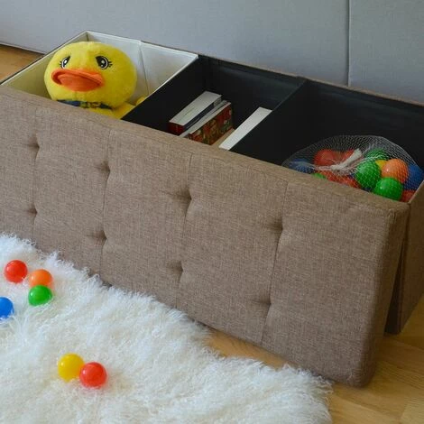 Le pouf trois places de DuneDesign est plus qu’un simple banc! Le beau meuble impressionne non seulement par son aspect moderne recouvert de tissu élégant, mais aussi par ses fonctionnalités multiples. Notre banquette pliant peut également servir de repose-pieds, bout de canapé, boîte pour ranger les objets (par ex.: livres, magazines, CD, DVD, chaussures, vêtements, jouets, etc.). Le coffre de rangement peut être placé partout: dans la chambre à coucher à côté du lit comme une table de chevet, dans le salon devant le canapé comme tabouret, dans la salle à manger comme siège supplémentaires pour les invités, dans la chambre des enfants pour ranger les jouets, dans le couloir / entrée comme banc pour porter les chaussures.